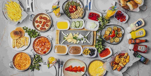 Çilek reçeli, bal,çikolata, süt reçeli, tereyağı, yeşil, ızgara, siyah zeytin, domates, salatalık, 4 çeşit peynir, kaymak, mevsimine göre 3 çeşit meyve, patates cips, gözleme, sahanda yumurta, sebze kızartma, rulo börek, paçanga böreği, soğan halkası, nugget, sahanda sucuk, sosis tava, menemen, dana jambon, hindi jambon, portakal suyu.