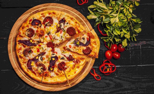 Pastırma, sucuk, mozarella, mantar, mısır, yeşil ve kırmızı biber, napoli domateslerinden özenle hazırlanmış pizza sosu.