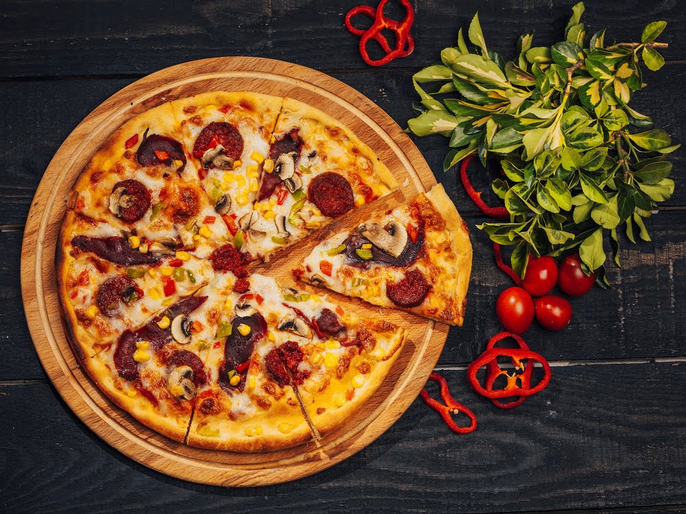 Pastırma, sucuk, mozarella, mantar, mısır, yeşil ve kırmızı biber, napoli domateslerinden özenle hazırlanmış pizza sosu.
