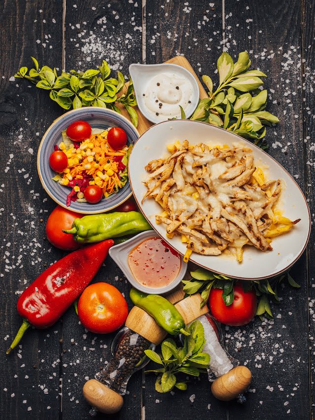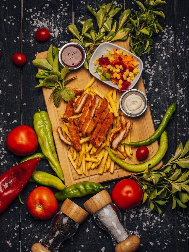 Iceberg, domates, kornişon turşu, özel harçla panelenmiş tavuk.